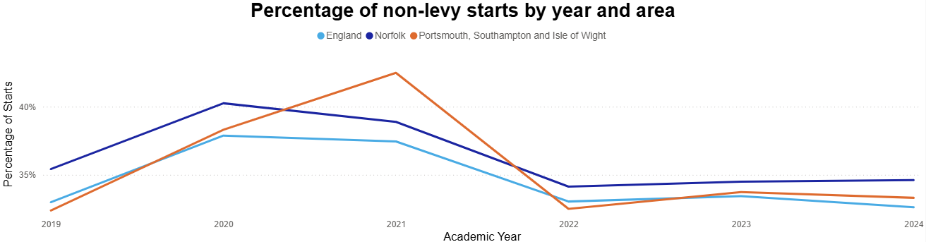 There are similar intermediary services up and down the country doing equally amazing work – with initiatives often delivered by accessing short-term funding. Along with co-founding hubs in Solent, Manchester, Bristol and London, we created the National Apprenticeship Hub Network (NAHN) - bringing the opportunity for like-minded colleagues to share practice, lessons learned and opportunities for collaboration. The NAHN comprises around 25 organisations, services and projects providing free and impartial information, advice and guidance to businesses, predominantly SMEs, to champion and stimulate the growth of apprenticeships in their local area. The numbers speak for themselves, with areas like Norfolk and Solent surpassing the national average in terms of apprenticeship starts with employers who don’t pay the Apprenticeship Levy. (Click the graph to expand)