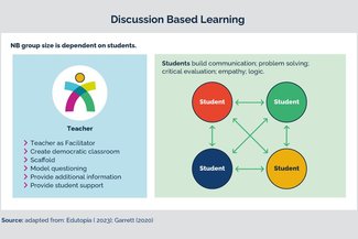 Learning approach: In discussion-based learning, teachers are facilitators, who create a democratic learning environment in which students are encouraged and supported to take the lead in classroom discussion through peer-to-peer dialogue and discourse. Students build their knowledge, skills, and critical reasoning through peer and teacher dialogic interactions, rather than through traditional didactic teacher transmission of subject information. Evidence suggests dialogue-based group discussion strategies support the development of critical thinking and reasoning, problem solving, and a deeper understanding of the subject area, as well as building student communication skills (Edutopia,2023).